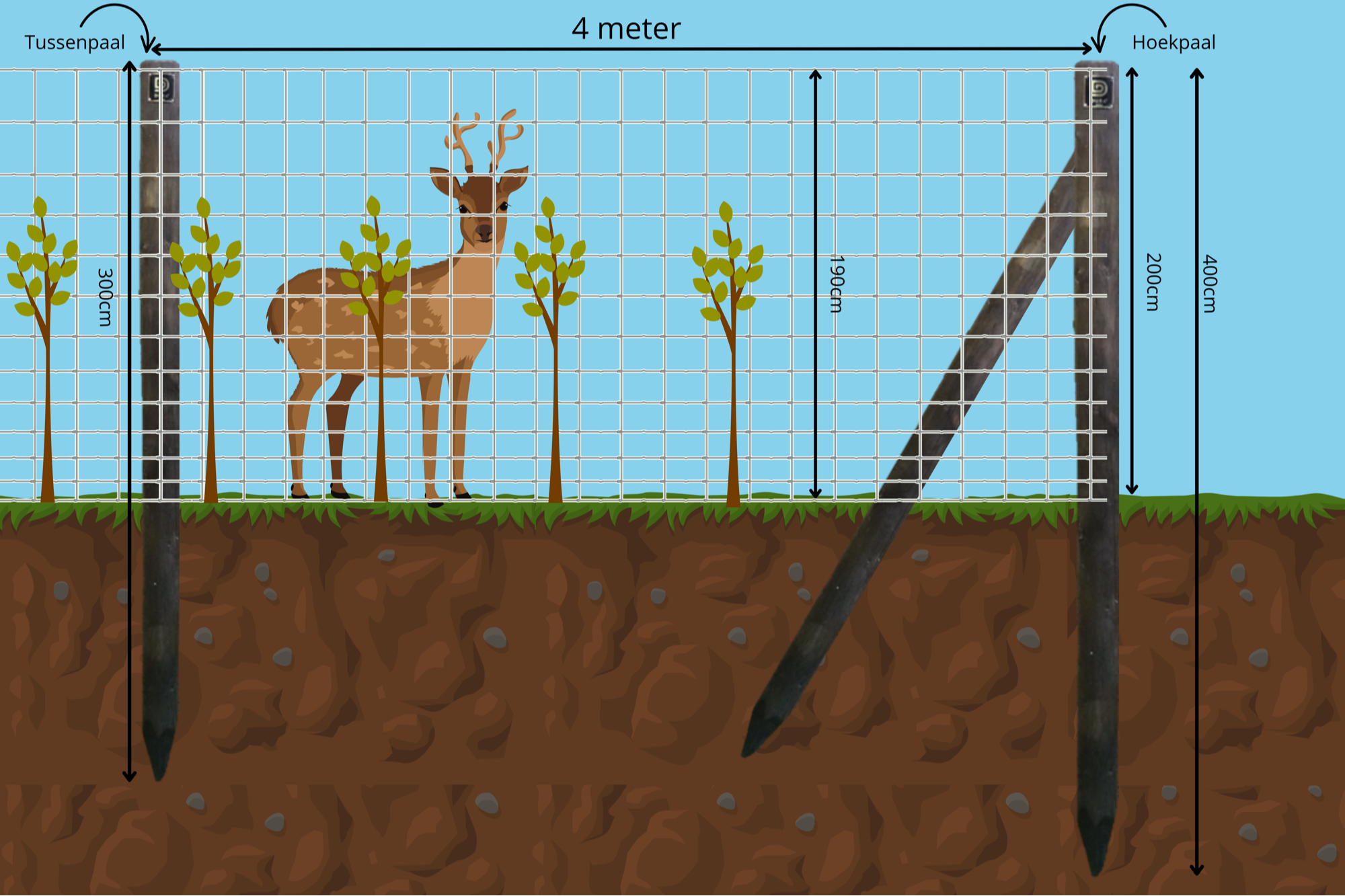 - Gebruik tussenpalen Ø10cm 300cm lang en hoek/eindpalen Ø14cm 400cm lan